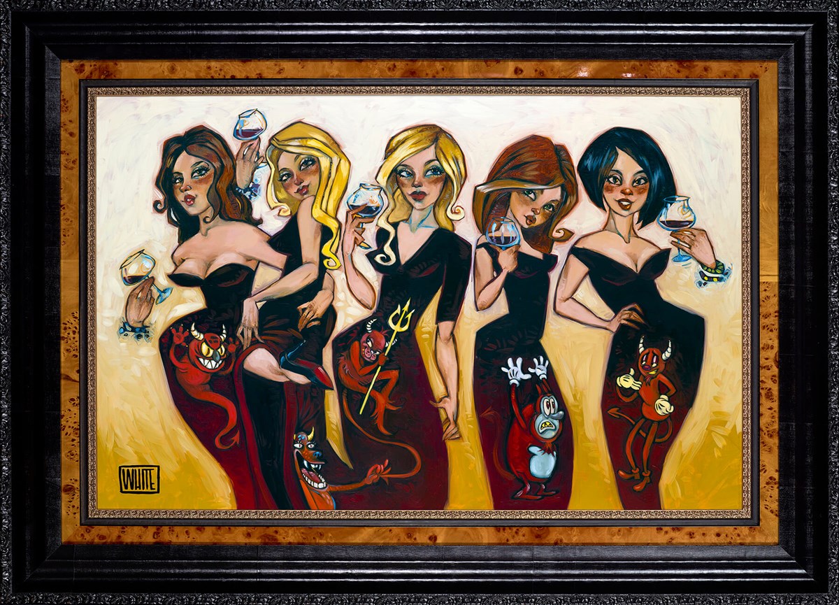 This new limited edition from Todd White is devilishly good! Released as part of Autumn 2023 collection ‘High Spirits’, ‘Devils on the Wine’ features five mischievous ladies dressed to kill, drinks in hand and ready for a night on the town. Each beauty sports a chic black dress in varying styles, each with a red devil design. This framed canvas on board artwork measures 32 x 22” and has been released as a limited edition of 100.