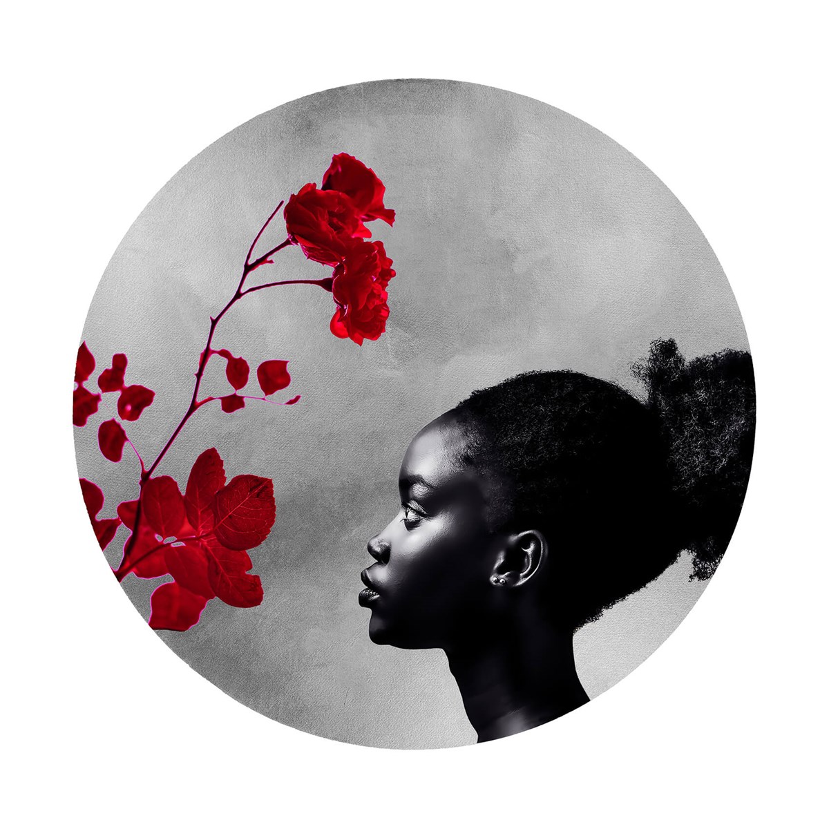 This beautiful image from innovative artist and lead singer of the Prodigy, Maxim, was inspired by a photograph of a young woman the artist took in Ghana. Her perfect profile is presented within a circular mount and is balanced by the flowers and foliage she is looking at; while the rest of the painting is black and white, these are depicted in crimson. Created as a silkscreen edition of 150 and measuring 28 x 28”, ‘Exhale’ can be displayed with its partner piece, ‘Formation’, but will also make an impact when presented as a standalone piece.