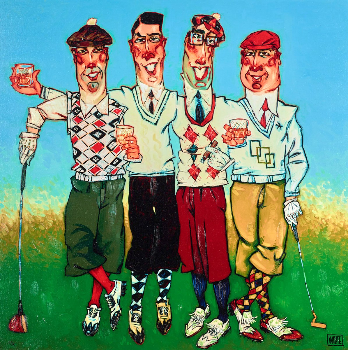 ‘Fore’, by American artist Todd White, is an embellished print presented as a canvas on board artwork, measuring 24 x 24” and released as a limited edition of 50. This golf-themed character study is classic Todd White, with its group of ruddy-cheeked golfers looking slightly sozzled and ready for a day on the course. This group is dressed to a ‘tee’ in their head-to-toe golf attire in a warm colour palette – rich accents against a bright and sunny background of yellow, sky blue and green.