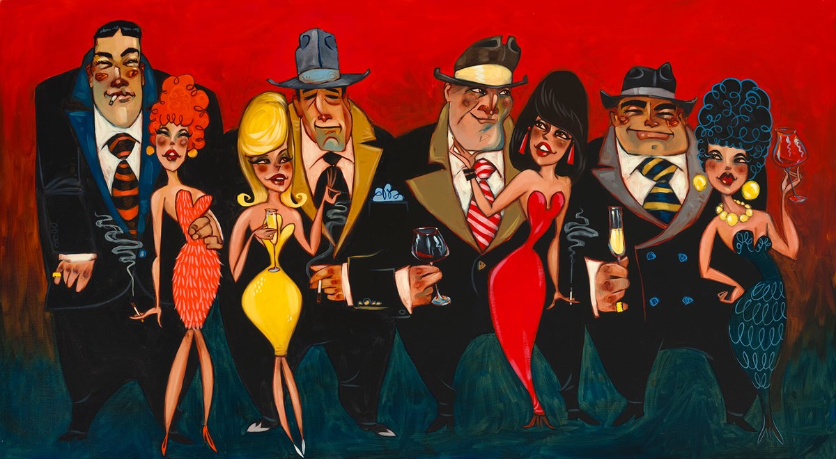 Step into the spirited nightlife of Todd White’s ‘Friday Night Molls’, an embellished canvas on board measuring 36 x 20” and framed at 45 x 29”. Limited to 75 editions, this piece brims with intrigue and playful sophistication, depicting a group of four gangsters and their glamorous molls. White’s iconic style captures their confident poses, subtle gestures, and cheeky expressions, while the bold red background enhances the theatricality of the scene. Deep blacks, warm flesh tones, and splashes of vibrant colour combine to create an artwork that is rich and visually captivating.