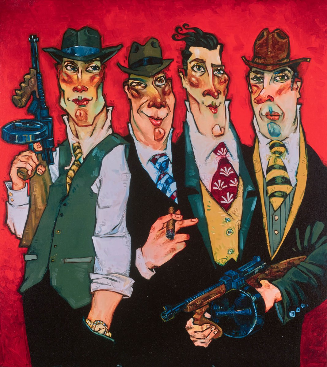 ‘Gangstas’, by American artist Todd White, is an embellished print presented as a canvas on board artwork, measuring 25 x 28” and released as a limited edition of 75. This character study is classic Todd White, with its group of shifty-eyed gangsters looking casual yet cautious as they stand armed and ready for whatever comes their way. These sharp shooters are dressed to kill in their tailored suits and colourful cravats of red, yellow, blue and green – bright highlights against a rich background of deep orange.