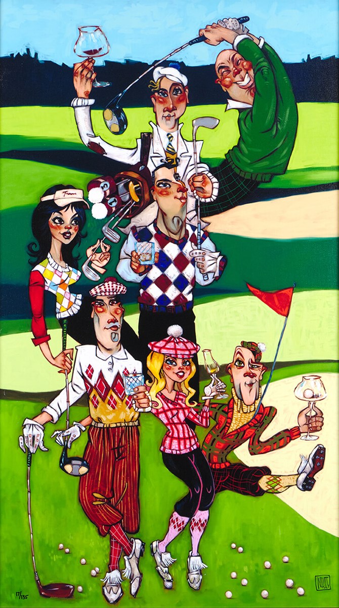 Golf Balls is a lively limited-edition artwork by American contemporary artist Todd White, capturing the playful chaos of the country club with his signature wit and style. This embellished canvas on board, measuring 20 x 35", brings together a cast of characters mid-round, mid-conversation and mid-mischief, each rendered with expressive gestures and knowing glances that hint at stories unfolding just beyond the frame. Set against a vivid palette of fresh greens, sky blues and crisp whites, the composition balances humour with painterly detail, drawing the eye across every corner of the scene. Presented in a classic dark frame that complements its rich tones, Golf Balls is released as a limited edition of 135.