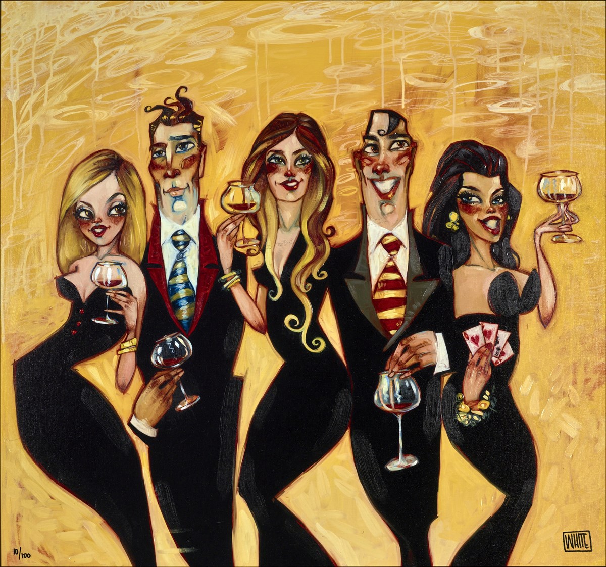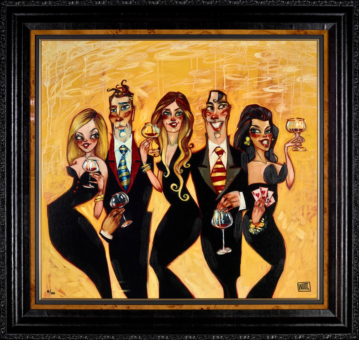 In ‘Heights of your Halos’, worldly-wise American artist Todd White depicts a glamorous group of socialites enjoying a night of flirtation and hedonism. Two beautiful blondes and a curvaceous brunette sport classic floor length black dresses, while their black-suited swains have gone for colourful striped ties. One of the women is displaying her four-of-a-kind poker hand, and all five party-goers are accessorising their outfits with Todd White’s signature glasses of red wine. Despite the title, we strongly suspect that virtue will be taking a back seat and that no halos will be polished tonight! This vibrant framed limited edition of 100 copies measures 28 x 26”and will introduce a party atmosphere into any interior.
