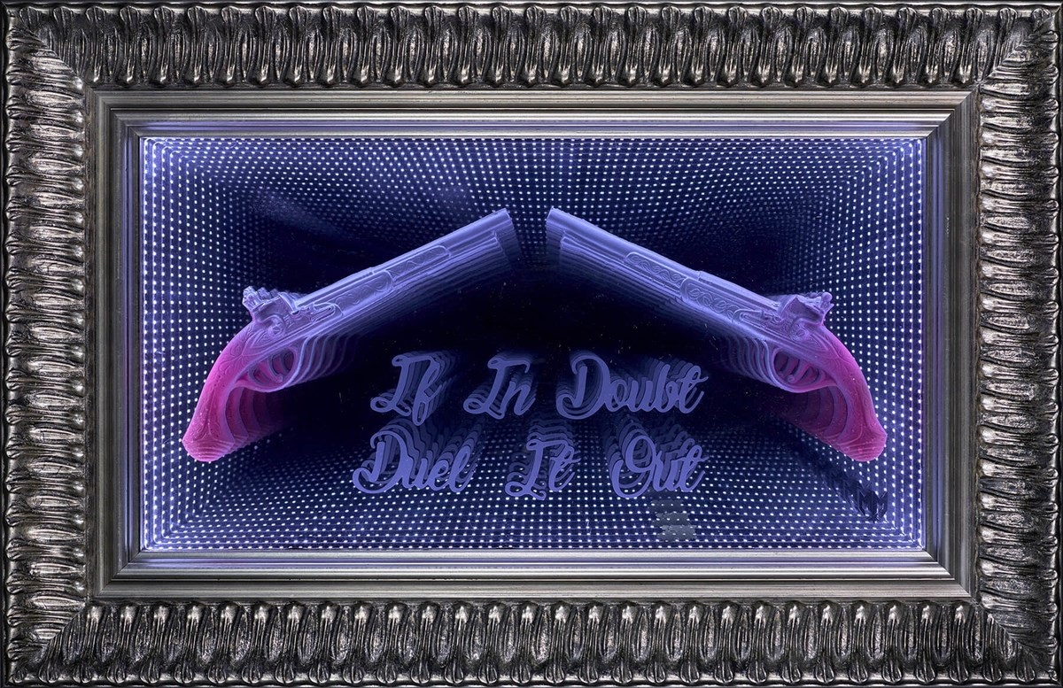 Multi-talented Prodigy frontman and cutting edge artist Maxim has described 'If in Doubt' as his 18th century approach to problem solving! Dominated by shades of indigo, purple and pink, the piece depicts two elegantly rendered traditional duelling pistols in the foreground along with the words, ‘If In Doubt, Duel It Out’. The central subject is mounted onto a mirror, and the ingenious use of LED lighting leads our eye towards an intriguing and unknowable point in the distance. This special infinity mirror edition of 49 copies measures an impressive 39 x 22” and creates a stunning and effective centrepiece.