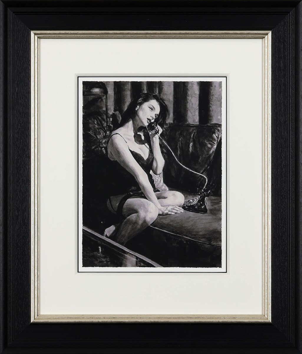 ‘Late Night Call’ offers a quiet glimpse into the solitude of the night — a figure lost in thought while on the phone, surrounded by soft shadows and suggestion. This limited edition on paper, sized 12 x 16” and available in an edition of 95, is rendered in monochrome with the artist’s signature chiaroscuro. Perez captures both strength and vulnerability in a single breath, inviting us to imagine the story behind the moment: who she’s talking to, what she’s thinking, and what the moment conceals. A masterful balance of mood, mystery and emotion.