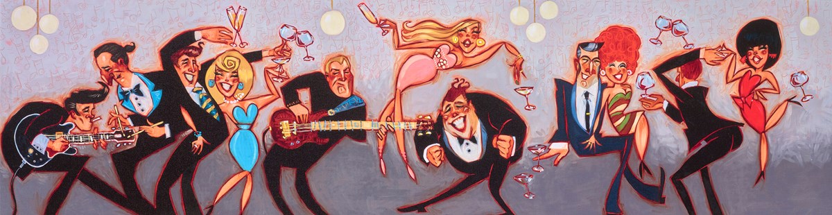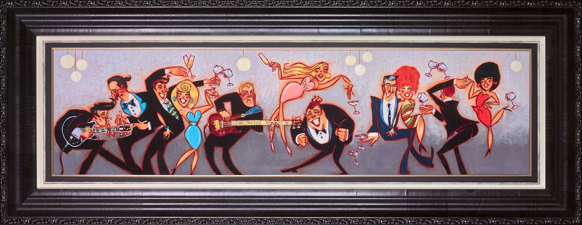 ‘Levitate’, by American artist Todd White, is an embellished print presented as a canvas on board artwork, measuring 43 x 12” and released as a limited edition of 100. This cool contemporary piece, in its chic frame, depicts one of the artist’s popular party scenes with a colourful cast of characters dressed to impress and having a good time - and in some cases spirits are lifted so high that they’re literally soaring! The almost monochrome colour palette of black, white and grey is accented by highlights of bright turquoise, coral pink and red.