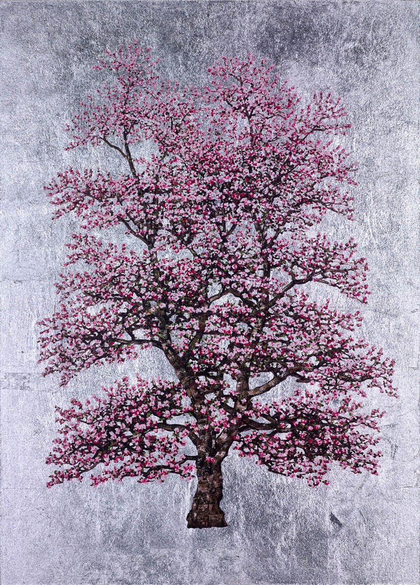 ‘Silver Dawn’ is a contemporary fine art print on silver leaf by British artist Jack Frame. This exquisite painting of a cherry blossom tree, or Sakura, captures the beautiful contrast of the tree’s towering might with the delicate nature of its soft pink flowers, set against a luxurious background of cool silver. The image itself measures 23 x 32” and the artwork has been released as a framed limited edition of 150.